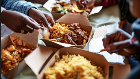 Jollof rice, fried rice, coconut rice, soups, swallows, and protein options for families or office lunch packs.
